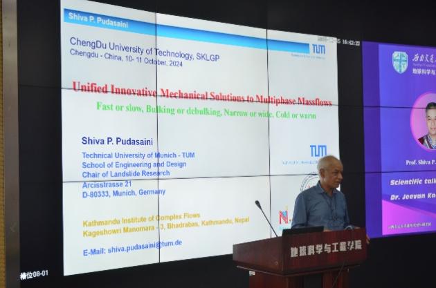 15日下午,Shiva P. Pudasaini 教授做了题为“Unified Innovative Mechanical Solutions to Multiphase Massflows: Fast or Slow, Bulking or Debulking, Narrow or Wide, Cold or Warm”的学术报告。Pudasaini教授是复杂多相流(泥石流、雪崩、冰湖溃决洪水、水库中的重力流等)建模与应用领域的世界权威科学家,在国际上享有极高的声誉。在此次学术报告中,Pudasaini教授针对滑坡、冰-岩崩碎屑流、冰崩等重大地质灾害在失稳和运动过程中所涉及的摩擦热效应、动力学破碎过程、基底侵蚀效应等开展了丰富而系统的讲解。