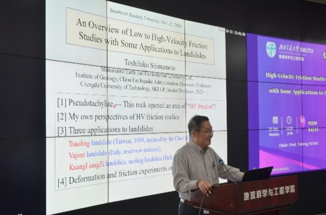 21日下午,Toshihiko Shimamoto教授作了题为“An Overview of Low to High-Velocity Friction Studies with Some Applications to Landslides”的精彩学术讲座。Shimamoto教授是国际断层和地震力学实验研究的领先学者,其开创性研发了独特的高速旋剪实验技术,成功解决了地震物理领域的众多热点问题。Shimamoto教授回顾了高速摩擦装置的发展历史,并且从野外实际证据出发,深入浅出地讲解了应用高速摩擦实验模拟自然断层和滑坡运动的可能性,揭示了摩擦熔融中的反馈过程和矿物相变。最后,展望了高速摩擦装置未来的发展方向,并对断层和滑坡的研究进行了展望。讲座结束后,Shimamoto教授与部分老师和学生留影纪念。