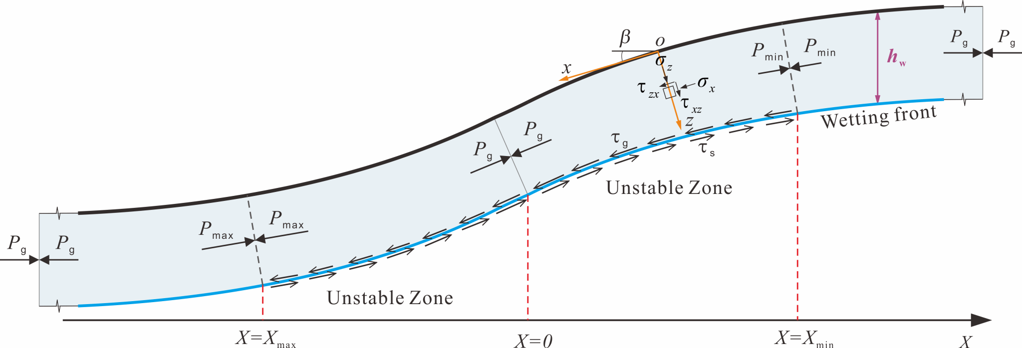 相较于直线型斜坡与简单边坡,具有非线性剖面形态的自然斜坡是降雨诱发滑坡的主要载体。因此,由于忽略了斜坡几何连续变化产生的边界效应,当前基于无限斜坡或简单边坡的评估模型在自然斜坡中的应用有限。在土体基质吸力降低与重度增加的共同作用下,自然斜坡的局部失稳往往在剖面最陡处开始,并逐渐向上下坡发展,较缓处坡体则制约着斜坡失稳的扩展范围即滑坡的规模,这一现象已在海底滑坡中得到了证明。然而,降雨入渗过程中非线性残坡积土斜坡的渐进破坏机理与失稳扩展范围仍是当前研究的空白,而对这一问题的回答是自然斜坡中降雨滑坡成功预测预报的关键。