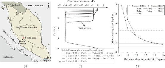 图6.模型应用(a)研究区域(b)不同降雨工况下的湿润峰深度(c)不同中心坡度下的临界湿润峰深度