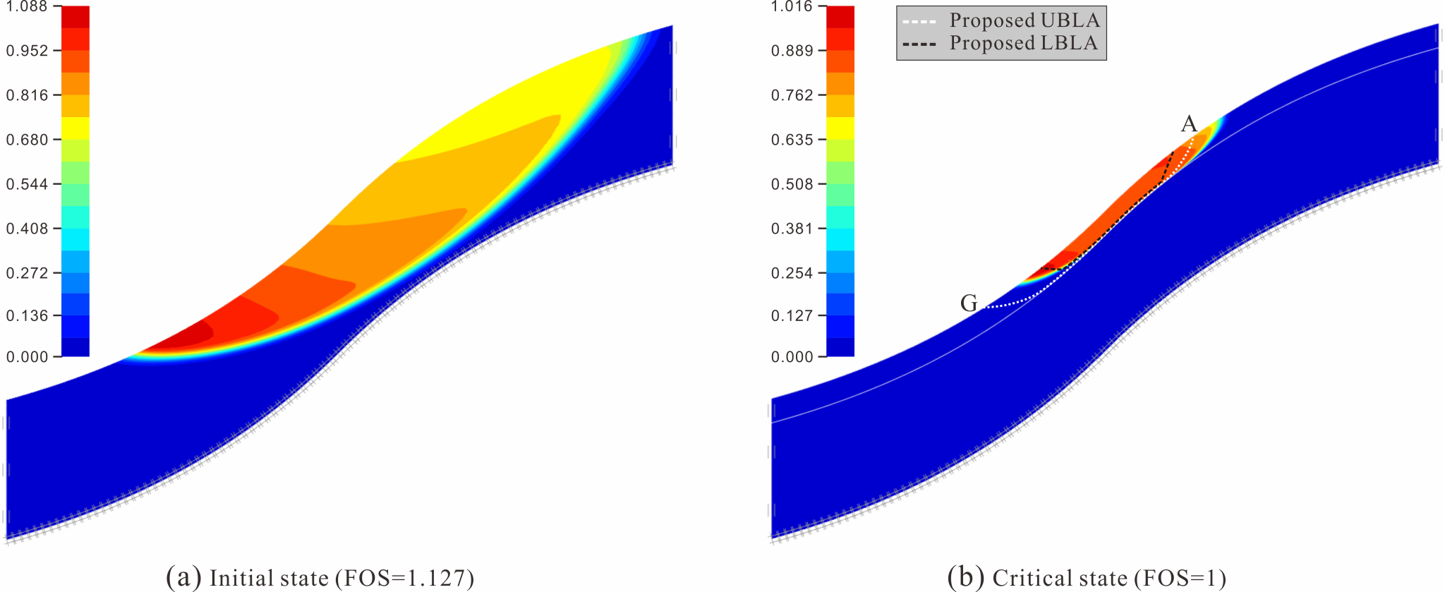 (2)在下限分析中,坡体可能先发生主动破坏并伴随着上坡裂缝的形成,这与野外观测到的现象一致,即在某一降雨事件中,斜坡仅在上坡发生主动破坏,并形成拉裂缝。然而,随着降雨的持续,下部斜坡可能会进一步发生被动破坏,此时,斜坡失稳将演变为整体滑动。