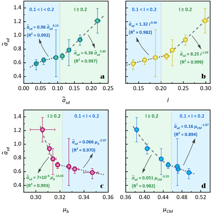图3 颗粒流基底应力波动与惯性数及摩擦系数之间的量化关系